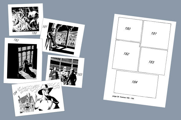 Ylläolevassa kuvassa esitellään sarjakuvasivun kuvat ja valmiksiruudutettu